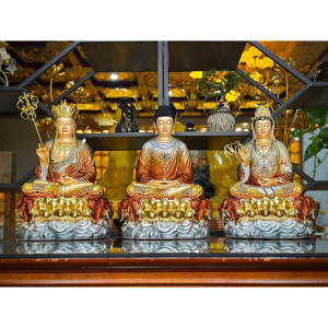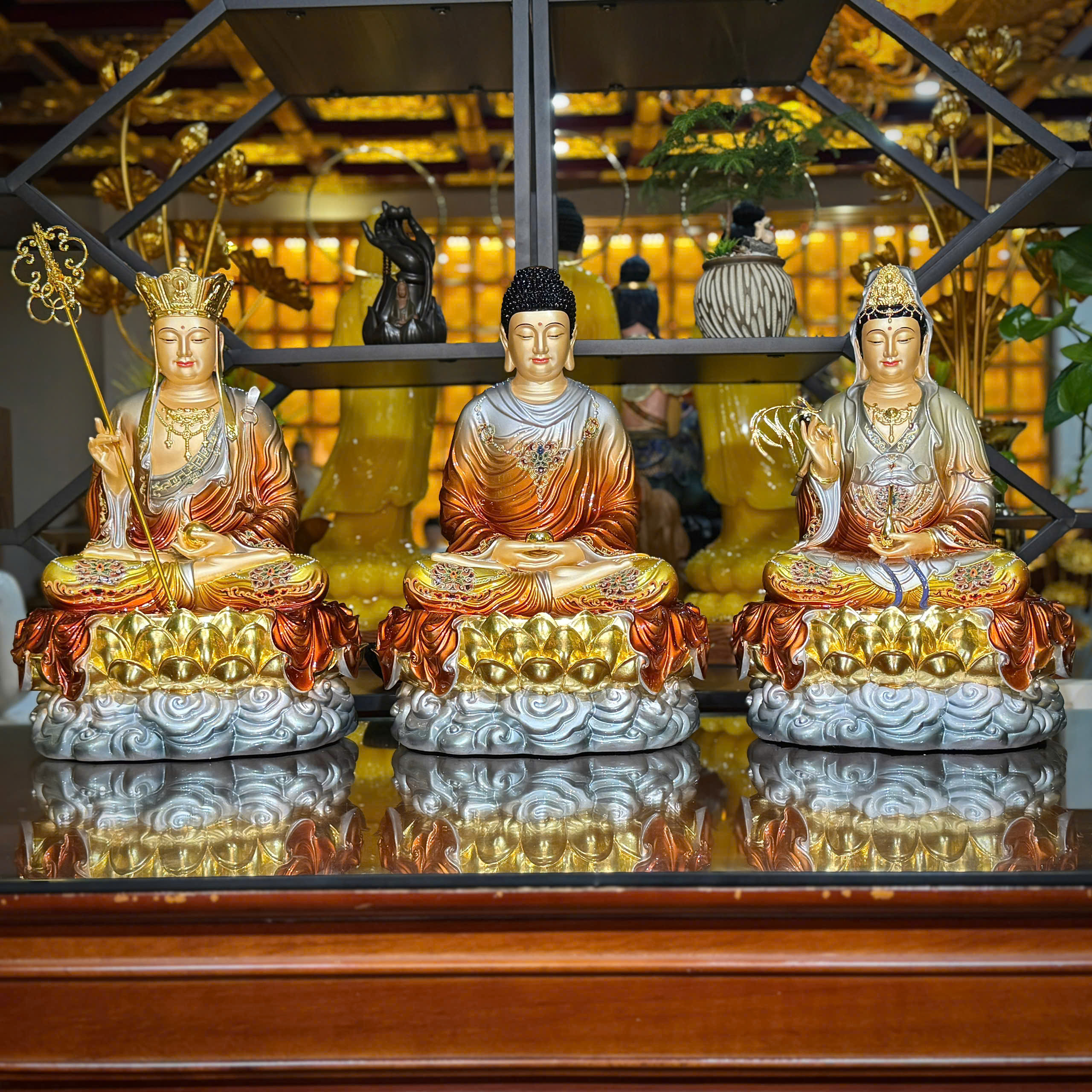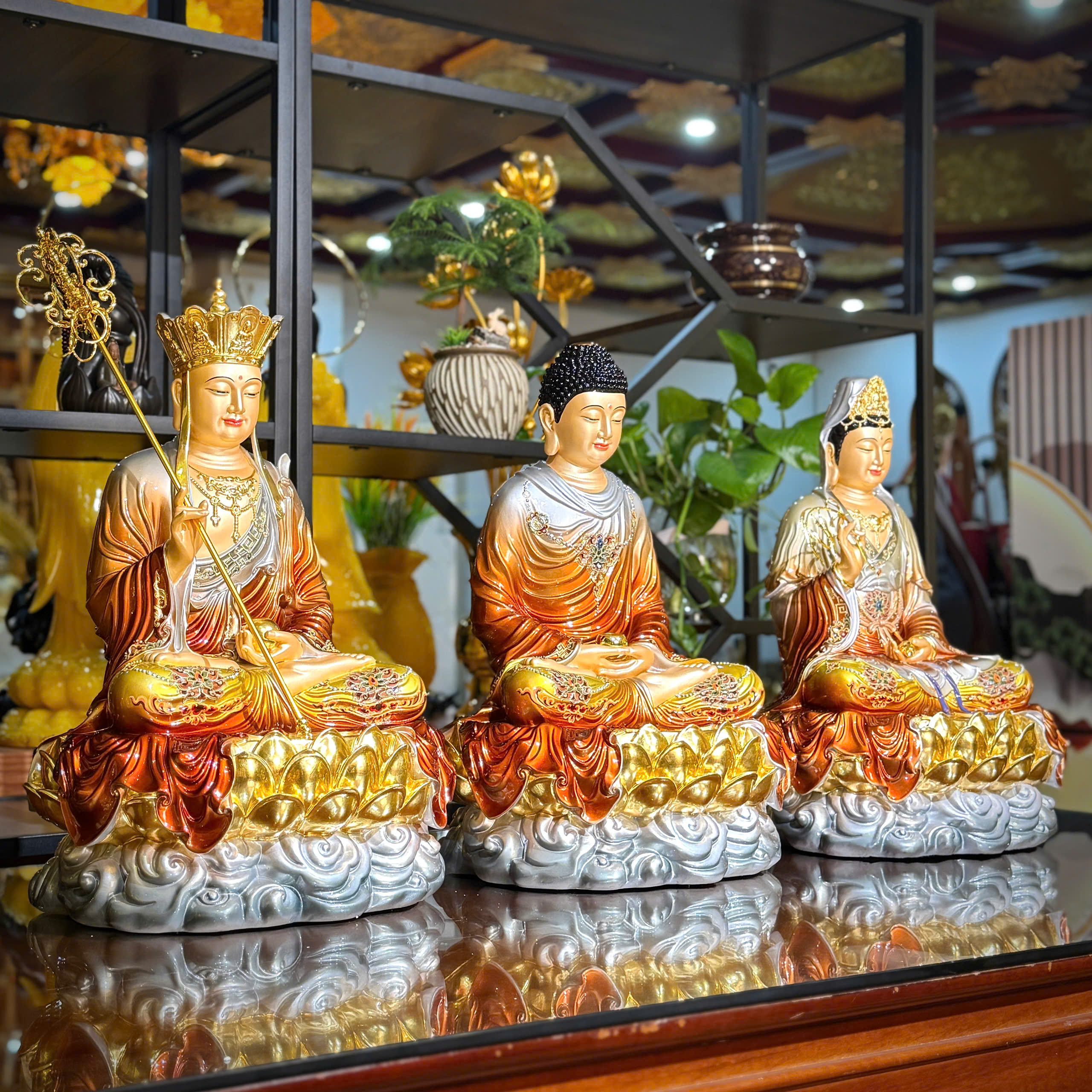 Bộ Tượng Ta Bà Tam Thánh gồm Phật Thích Ca Mâu Ni (ở giữa), hai bên là Bồ Tát Quan Thế Âm và Bồ Tát Địa Tạng, được chế tác từ bột đá cao cấp kết hợp sơn giả đồng thủ công tinh xảo. Tổng thể tượng mang thần thái trang nghiêm, từ bi và trí tuệ, phù hợp thờ tại chính điện, chùa chiền, tư gia, phòng thờ Phật.