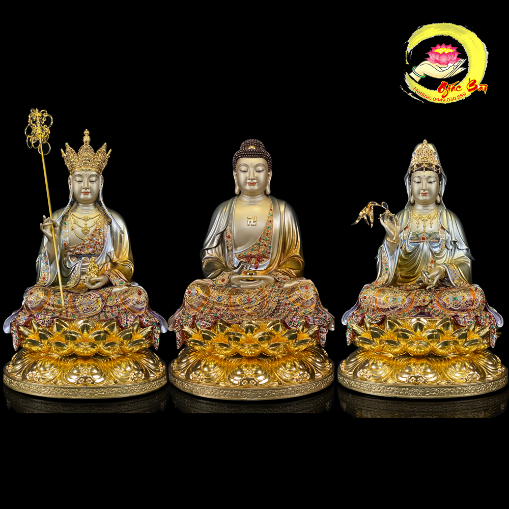 Bộ Tượng Ta Bà Tam Thánh Giả Men Cổ Viền Vàng Cao Cấp Bằng Đồng Cao Cấp